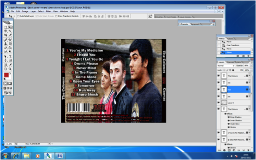 One of the problems that we faced was the image being too small, we could not stretch out the photo to fit the whole background because the song titles would overlapped the two of the band members, making the album look unprofessional. In order to avoid this we cropped a section of the background from another photo and added it to the image we had chosen.